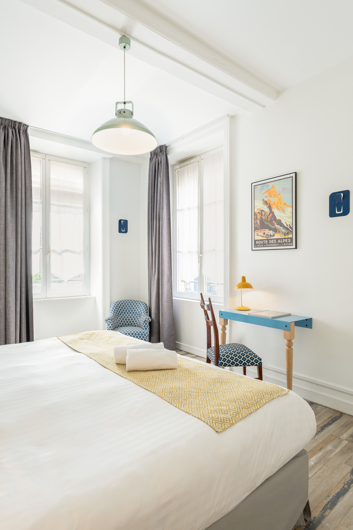 Une grande chambre double avec un lit Queen size (ou deux lits jumeaux sur demande), un coin bureau, une salle de bain privative, et ce supplément d’âme propre aux Aubergistes Lyonnais.