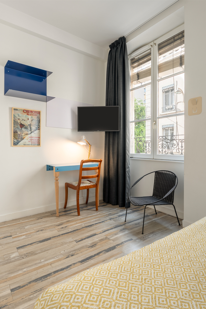 Plus spacieuse, toujours sobre mais généreuse, avec une salle de bains ou de douche privative, un coin bureau pour écrire ou rêver, et la même atmosphère chaleureuse qu’ailleurs dans l’hôtel.