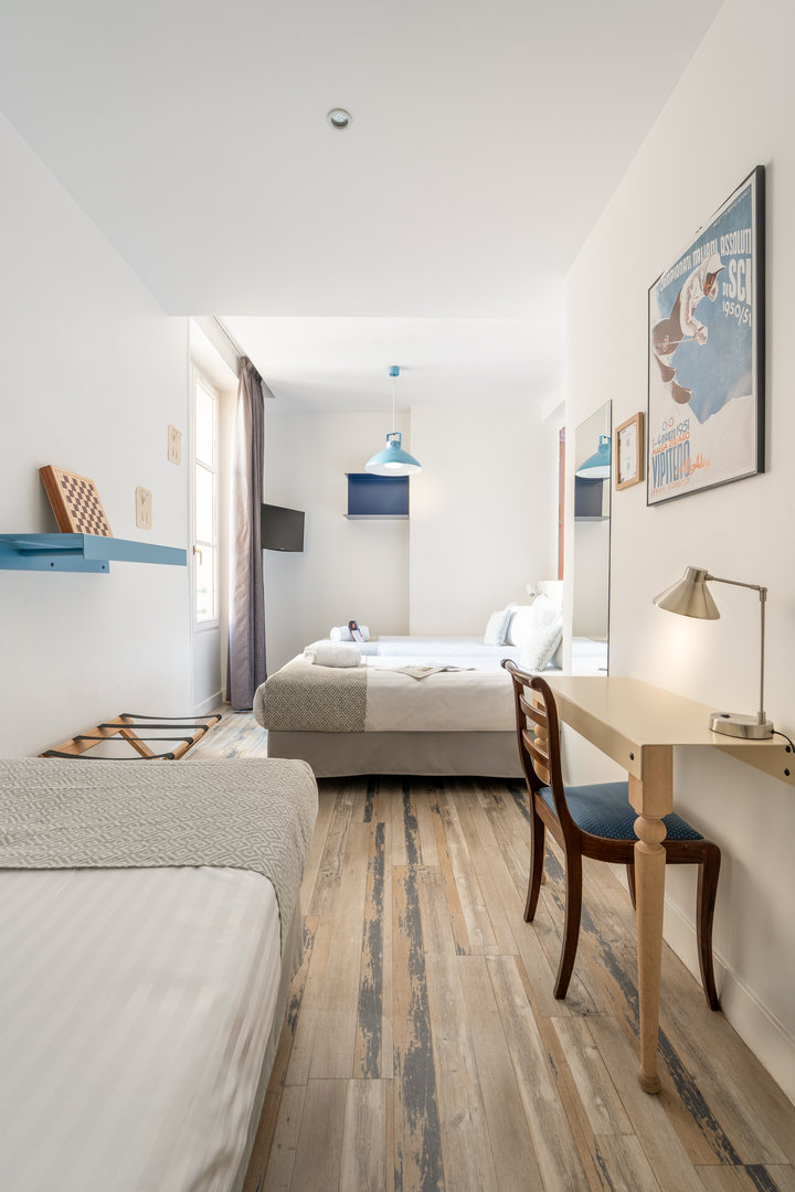 Composée d’un grand lit et d’un lit simple, ou de trois lits simples sur demande, elle est idéale pour les séjours à plusieurs. Avec même la possibilité d’une vue cour intérieure pour ceux qui ne rêvent que du grand calme.